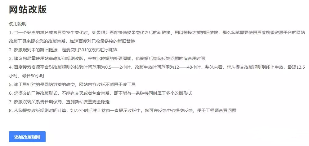 網(wǎng)站的鏈接改版首要用到的東西是百度站長渠道的網(wǎng)站改版東西,詳細(xì)細(xì)節(jié)闡明如下圖: